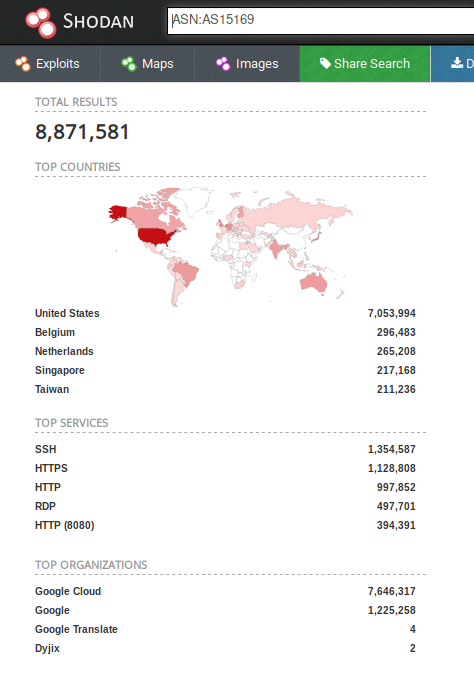 Knowing the ASN is helpful, because we can search Shodan for things such as coffee makers or vulnerable computers within our ASN, which we know (if we are a large company) is on our network.