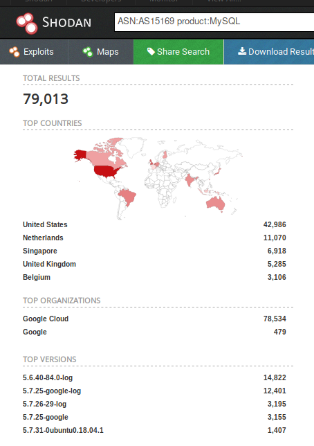 - What is the 2nd most popular country for MYSQL servers in Google’s ASN?